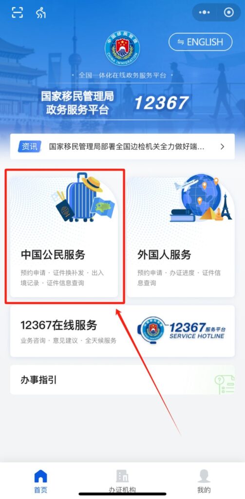 - 微信搜索「移民局 12367」,进入官方小程序。