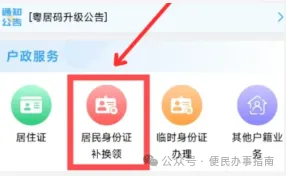 搜索粤居码小程序,进入首页点击居民身份证补换领。
