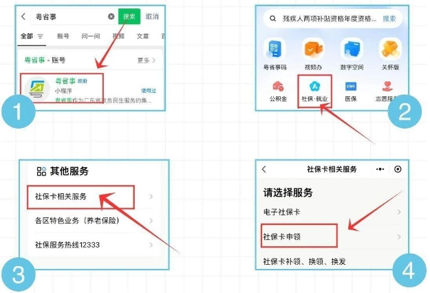 1.微信搜索粤省事,点击社保就业,下滑到其他服务点击社保卡相关服务,点击社保卡申领;