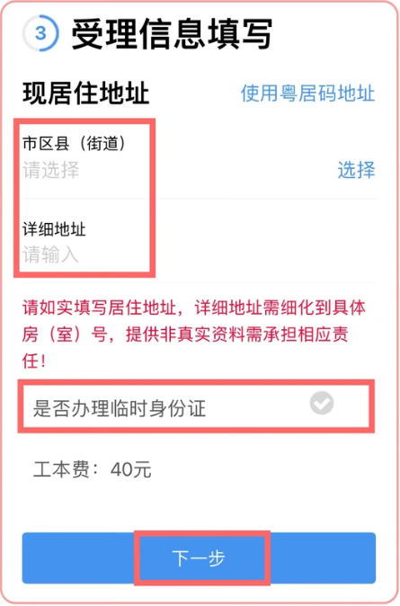 8、填写受理信息并选择是否办理临时身份证