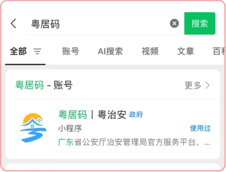 1、微信搜素“粤居码”小程序并点击进入