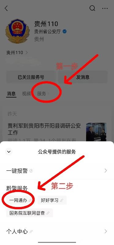 1.微信搜索关注 “贵州警事” 公众号,点底部服务→一网通办